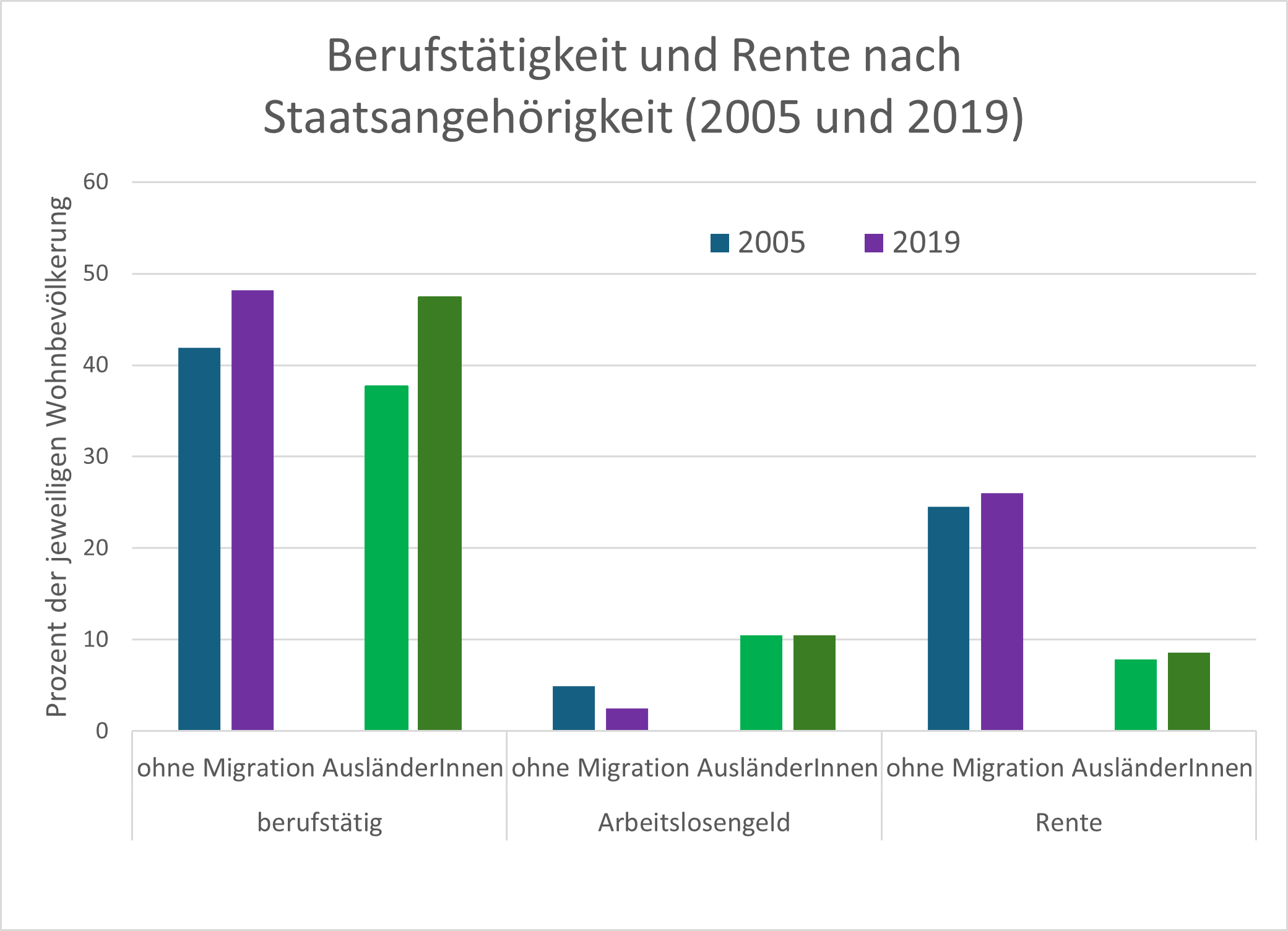 Fazit: AusländerInnen in Deutschland sind inzwischen fast zum gleichen Prozentsatz berufstätig wie Deutsche ohne Migrationshintergrund. Ihr Einkommen hat sich faktisch aber zwischen 2005 und 2019 deutlich vermindert.