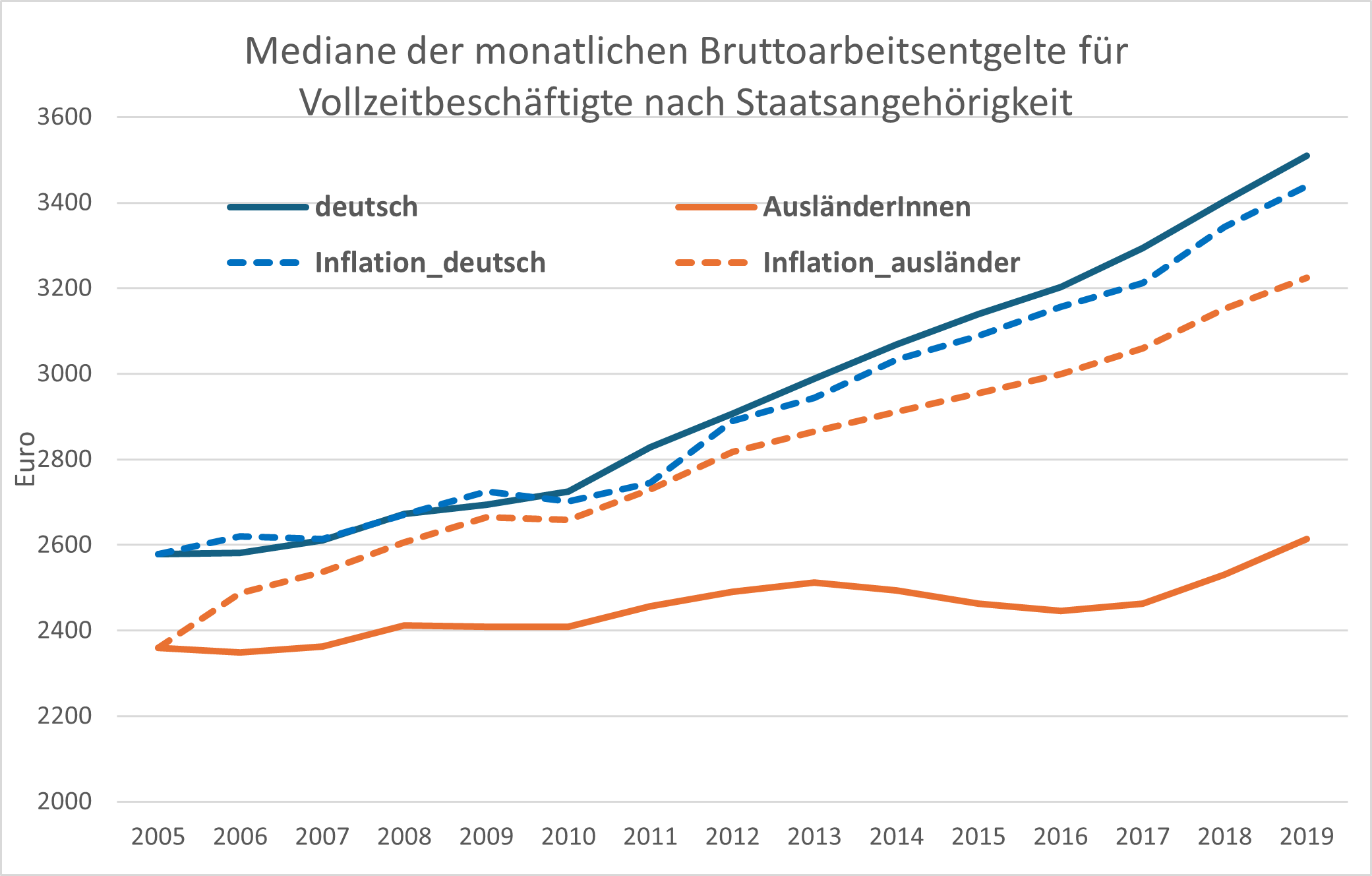 Zur Erklärung: in blau die Mediane (auf die Mitte der Bevölkerungsgruppe) bezogenen monatlichen Arbeitsentgelte, wenn sie deutsche Staatsangehörigkeit besaßen und keinen Migrationshintergrund hatten. In orange die Arbeitsentgelte, wenn sie AusländerInnen waren. Die gestrichelten Linien zeigt die Entwicklung der Inflation bezogen auf den Ausgangswert von 2005. Liegt die durchgezogene Linie oberhalb der farblich gleichen gestrichelten, dann kommt es zum Kaufkraftgewinn, liegt sie darunter, dann kommt es zum Kaufkraftverlust.