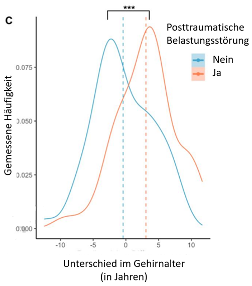 Ca. 1/5 der Menschen, die an den Rettungs- und Bergungsarbeiten am World Trade Center (WTC) am 11. September 2001 beteiligt waren, leiden seitdem unter einer posttraumatischen Belastungsstörung (PTBS). Eine aktuelle Studie vergleicht das „Gehirnalter“ von diesen HelferInnen mit PTBS (insgesamt 47 Personen) und alters-/geschlechtsgleichen HelferInnen ohne PTBS (insgesamt 52 Personen). Ergebnis: das Gehirnalter liegt bei denen mit PTBS um fast 3 Jahre höher (Abbildung unten, basierend auf Untersuchung mit einem Kernspintomographen). Ein wichtiger Faktor für das Voraltern war die Dauer (in Monaten), die die Helfer den Eindrücken der Zerstörung und des Leidens ausgesetzt waren. Daraus folgt, dass PTBS nach Trauma-/Gewalterfahrung ein Risikofaktor für beschleunigtes Altern sein könnte.