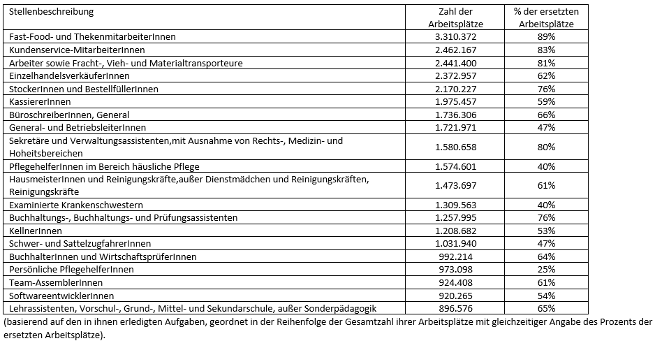 ChatGPTs Vorhersage der 20 Berufe mit den größten Arbeitsplatzverlusten, die in 10 Jahren durch künstliche Arbeit ersetzt werden könnten.