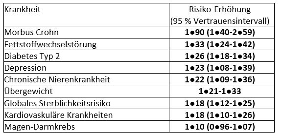 1. Der Konsum von ultrahochverarbeiteter Nahrung hat in den letzten Jahrzehnten weltweit deutlich zugenommen und liegt inzwischen bei weit über 50 % aller eingenommener Kalorien pro Tag. Gleichzeitig ist seit langer Zeit auch klar, dass diese Ernährung eine Vielzahl von chronischen Krankheiten häufiger werden lässt. Die Tabelle unten (basierend auf [1]) zeigt die jeweilige Erhöhung des Risikos für verschiedenste Erkrankungen. Die Spalte rechts ist so zu lesen, dass die prozentuale Erhöhung des Risikos durch die beiden Zahlen nach der 1 abzulesen ist (1•90 = 90 % Erhöhung des Risikos, 1•33 = 33-prozentige Erhöhung des Risikos).