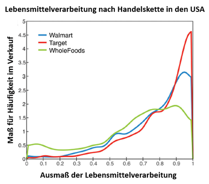 2. Walmart ist der größte Einzelhändler in den USA, mit einem Marktanteil von über 25% im Lebensmitteleinzelhandel. Target ist ein anderer großer Einzelhändler, der immerhin für über 22 % der Nahrungsmittelverkäufe in den USA verantwortlich ist. Ihre Marktmacht basiert stark auf dem Verkauf von hochverarbeiteten Lebensmitteln, wie ein Vergleich mit dem Anbieter Whole Foods zeigt. Die Abbildung [2] zeigt auf der X-Achse die Höhe der Verarbeitung (null = roh, unverarbeitet – 1 = maximal verarbeitet). Die Y-Achse zeigt die Häufigkeit der Waren im Angebot. Hochverarbeitete Nahrungsmittel sind bei Walmart und Target viel häufiger als bei Whole Foods, wie die rechts nach oben gehenden Kurven zeigen.