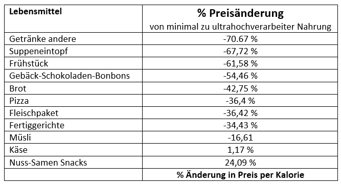 Wie deutlich billiger hochverarbeitete Nahrungsmittel im Vergleich zu niedrig verarbeiteten sind, zeigt die folgende Tabelle (basierend auf [4]). Eine Kalorie aufgenommen aus einem künstlich-hochverarbeiteten Getränk (3. Zeile von oben) z. B. ist fast 70 % billiger als aus einem ein niedrig verarbeiteten. Umgekehrt ist eine Kalorie aufgenommen in Form von frischem Käse (2. Zeile von unten) über 1 % billiger als verpackter, hochverarbeiteter.