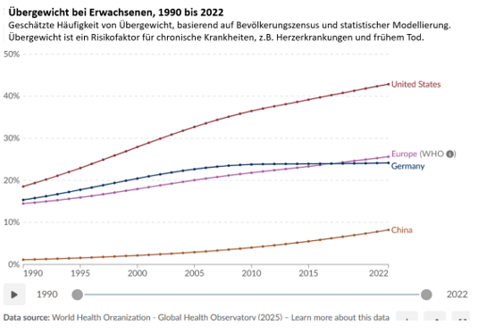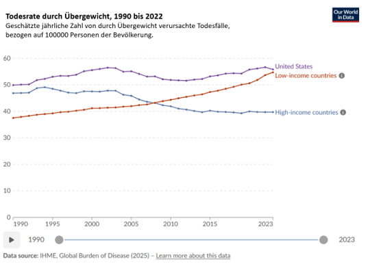 Die langfristigen Konsequenzen sind an der Zahl übergewichtiger Erwachsener in den USA und Europa und an der Zahl der Todesfälle in Folge von Übergewicht ablesbar, die die beiden Abbildungen unten zeigen (wobei ganz ähnliches für den Diabetes Typ II gilt, der inzwischen doppelt so häufig in den USA ist wie in Europa).