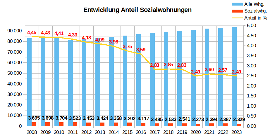Der Anteil der Sozialwohnungen an allen Wohnungen ist in Oldenburg von 4,45 Prozent in 2008 auf 2,49 Prozent in 2023 gesunken.
