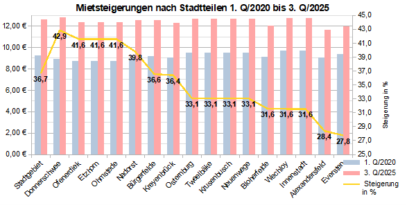 Die vielen auf dem freien Markt entstehenden Neubauten treiben die Angebotsmieten extrem in die Höhe – auch in Oldenburg. Dadurch haben sich Bestands- und Angebotsmieten in den letzten 10 Jahren immer weiter auseinanderentwickelt. Gut 60 Prozent aller durchschnittlichen Nettokalt-Bestandsmieten in Oldenburg kosten unter 8 €/m², gut 85 Prozent unter 10 €/m², während die Angebotsmieten im Stadtgebiet von 2020 bis 2025 um fast 37 Prozent auf durchschnittlich über