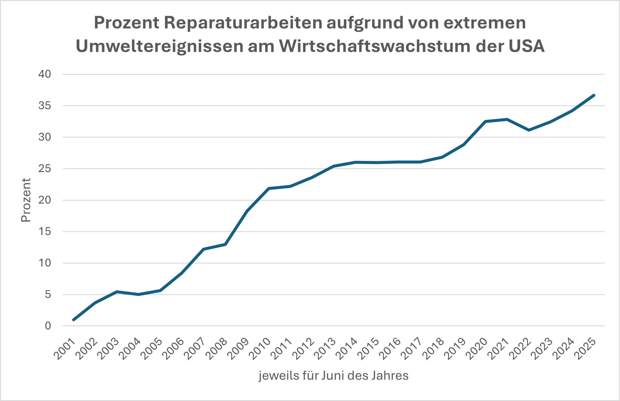 Die Abbildung zeigt, dass Wirtschaftswachstum der USA immer mehr darin besteht, die Folgen von extremen Umweltereignissen zu reparieren. Inzwischen macht dieser Anteil schon mehr als ein Drittel aus. Wenn extreme Umweltereignisse weiter zunehmen, kommt es bald zu dem Punkt, wo Wirtschaftswachstum = Reparaturmenge ist. Spätestens dann würde die US-Gesellschaft ärmer, obwohl die Wirtschaft wächst.