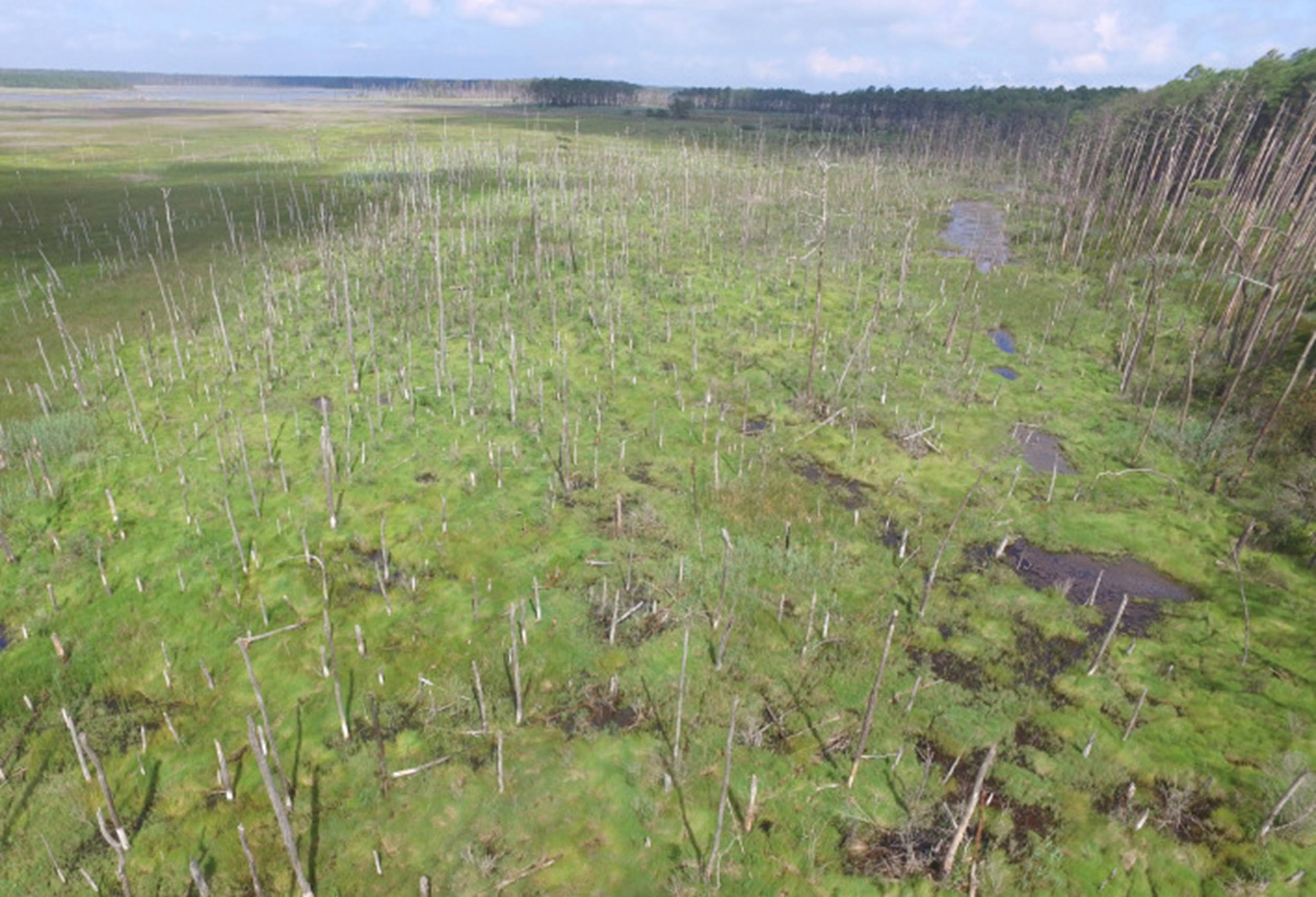 Am Beispiel des Kiefernsterbens wird das Ausmaß des durch den Anstieg des Meeresspiegels verursachten Waldsterbens deutlich.