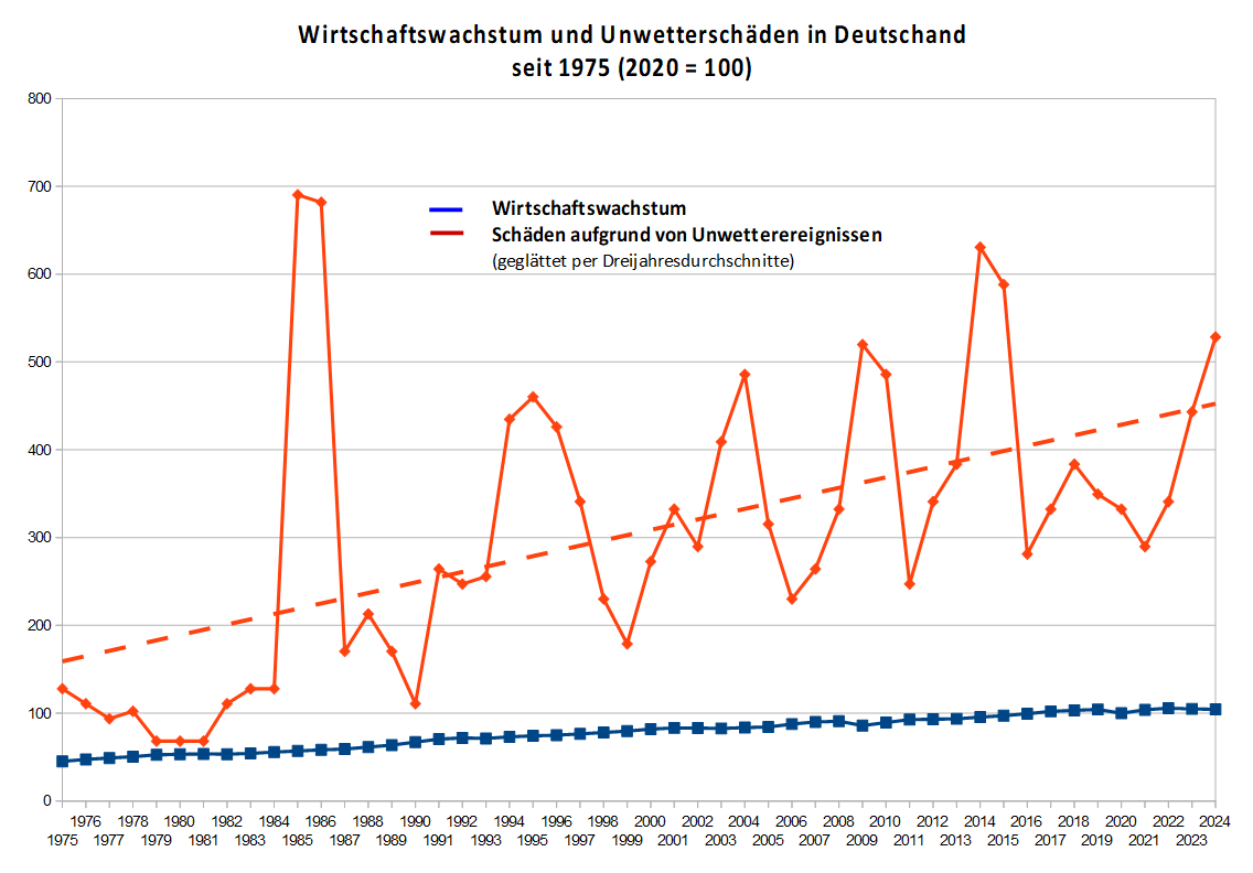Auch in Deutschland (siehe Beitrag zu USA unter wissenschaftsnachrichten-zu-oekologie-und-erderwaermung) zerren die versuchten Schäden durch Unwetter das Wirtschaftswachstum mehr und mehr auf: es kommt der Punkt, wo bei Wirtschaftswachstum die Gesellschaft insgesamt ärmer wird, weil die notwendigen Reparaturleistung nach Extremwetterereignissen dieses übersteigen.